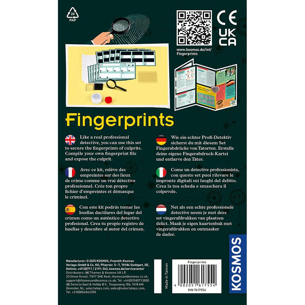 Contiene polvo para huellas dactilares, almohadilla de tinta, lupa, fichas para huellas dactilares, tarjetas para localizar huellas, pegatinas transparentes, láminas transparentes, pompones y manual paso a paso a color.