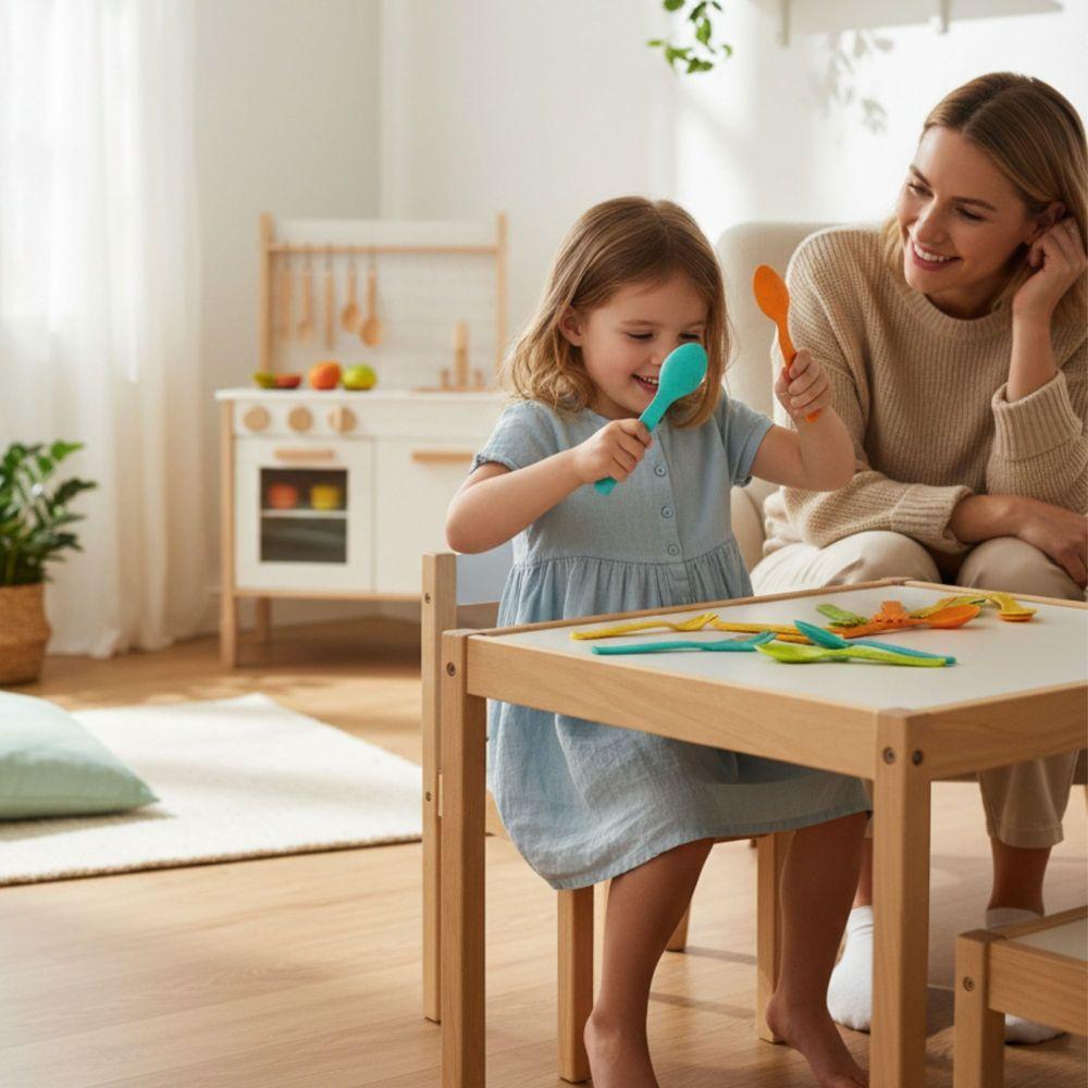 Este set de cubiertos es perfecto para completar el espacio de cocina en tu aula. Permite a los niños y niñas organizar la mesa, servir alimentos y recrear situaciones cotidianas de forma participativa y disfrutando del juego de roles.