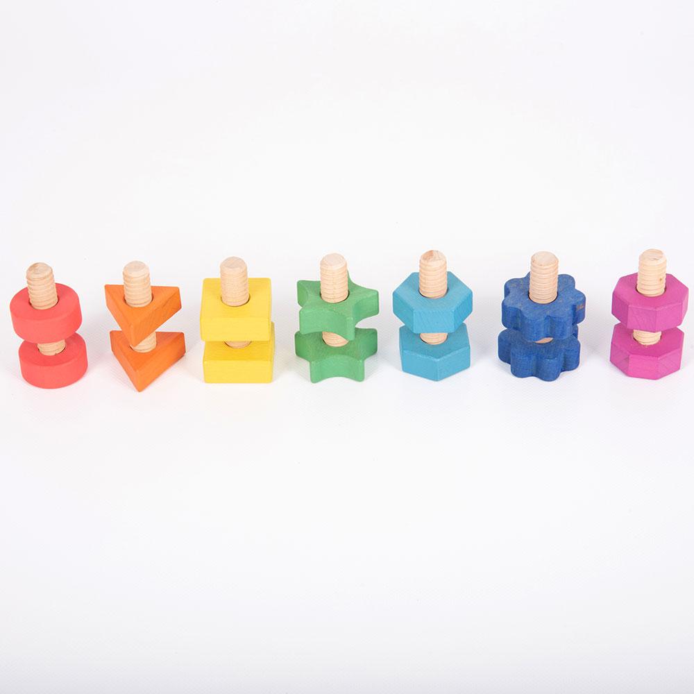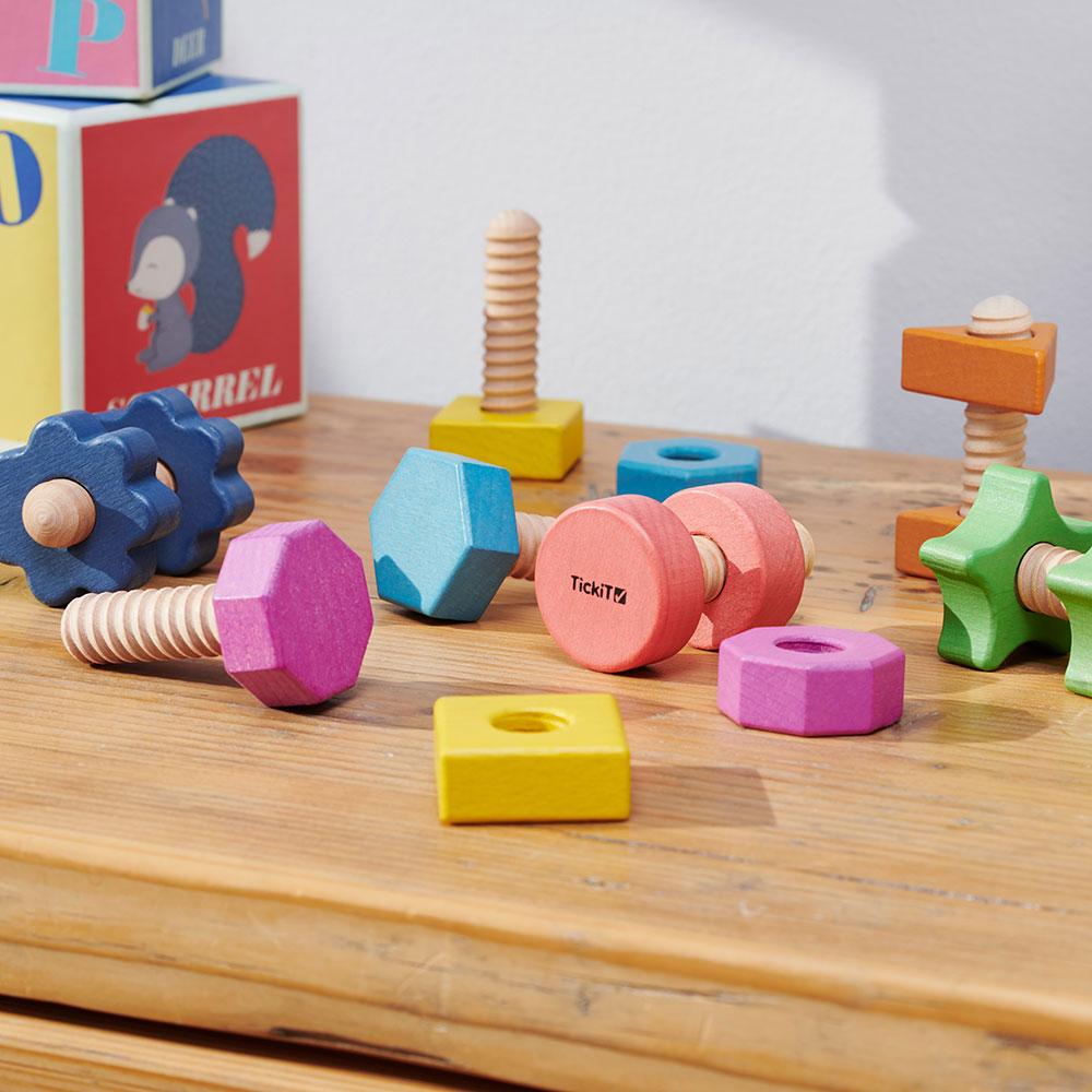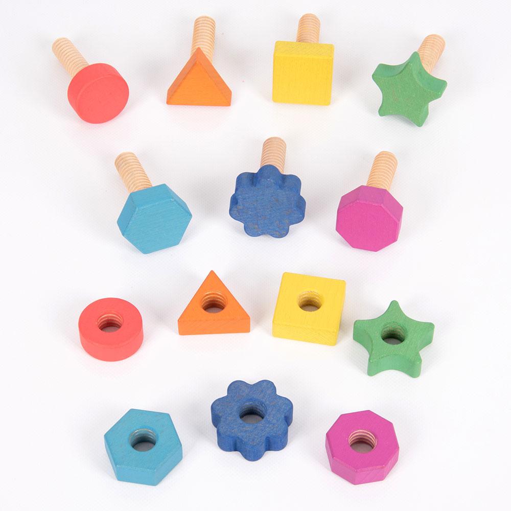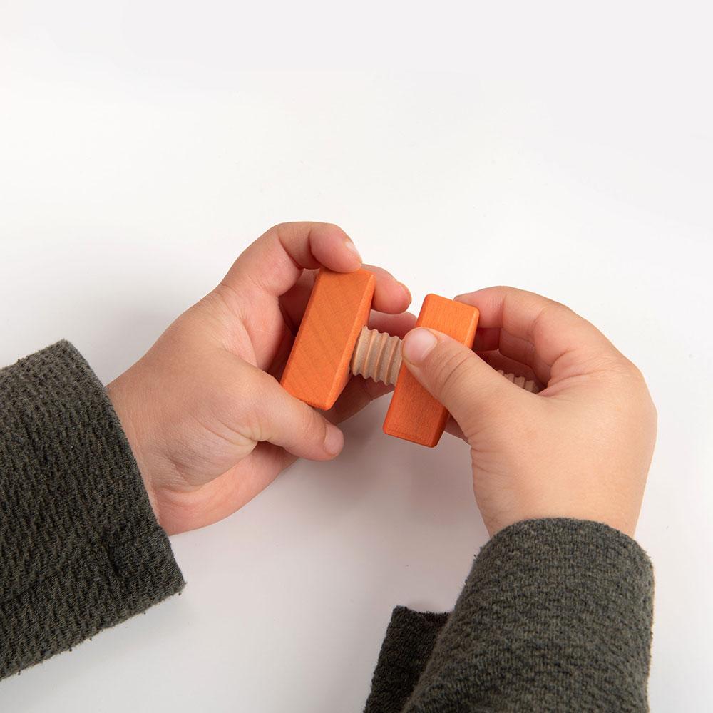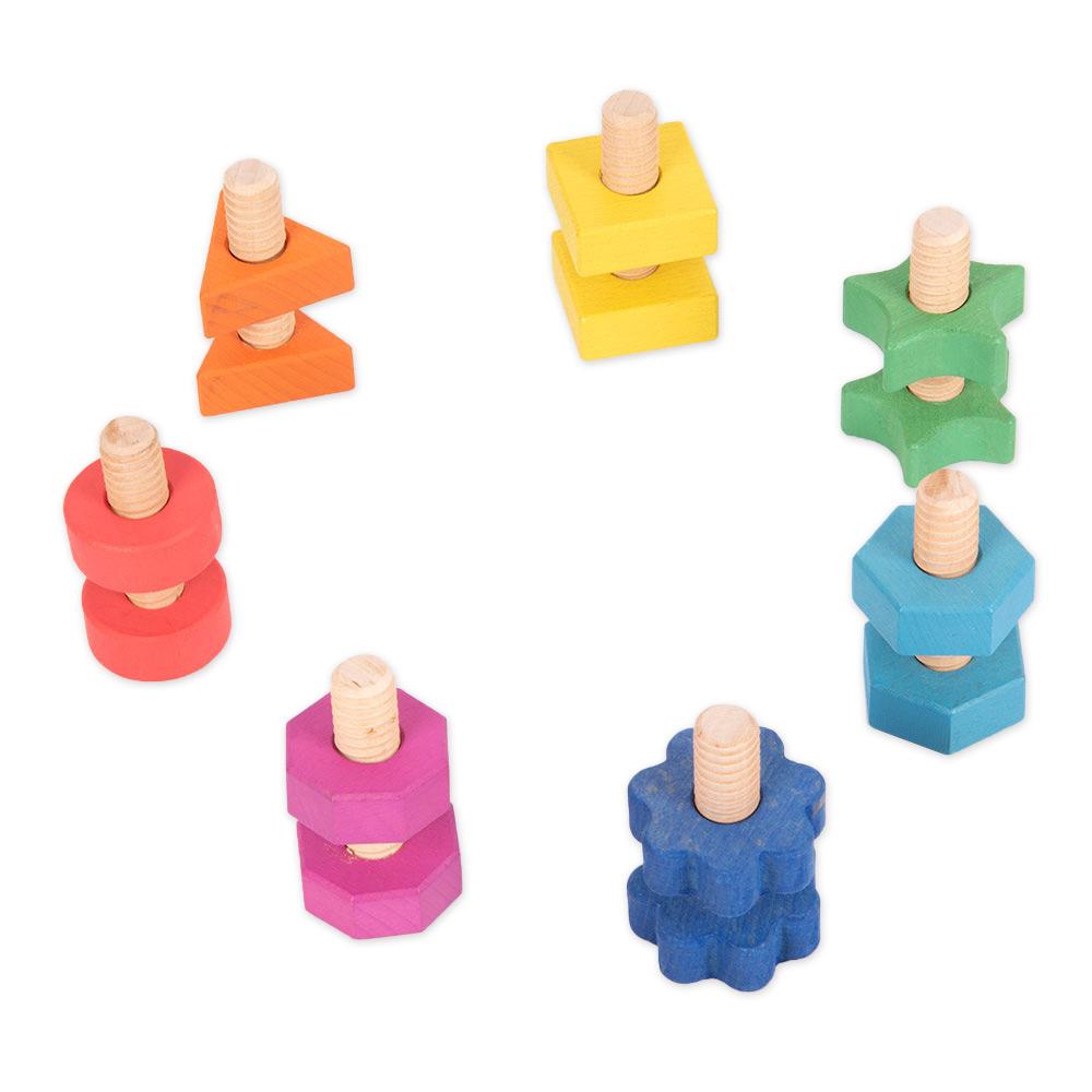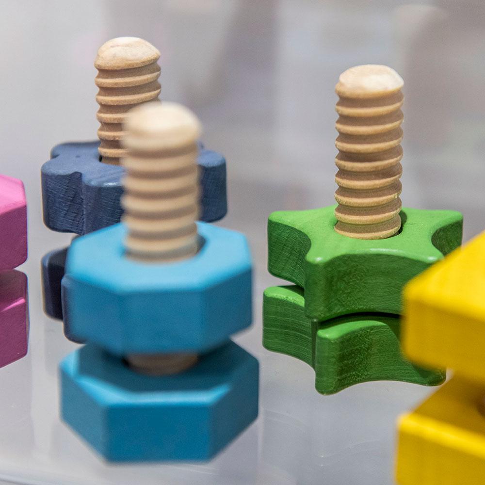 Con este set de tornillos y tuercas de gran tamaño, fabricados en madera, las manos más pequeñas podrán empezar a ensartar, organizar y clasificar, probando diferentes combinaciones de formas y colores o buscando repetir el mismo patrón; bien de forma libre, bien guiándose mediante de las instrucciones de un adulto. ¡Aprende a identificar formas geométricas!