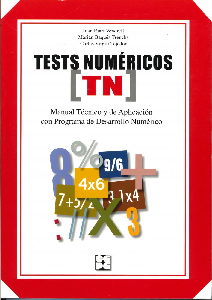 Los Test Numéricos (TN) constituyen una batería de 8 subtest dirigidos al alumnado desde 3.º de Educación Primaria hasta el final de la ESO. FICHA TÉCNICA TEST NUMÉRICOS Los Test Numéricos en su conjunto están constituidos por 8 test que son los siguientes: TECA27. Registro del Cálculo reversible. De 3.° de primaria a 4.° de ESO. TECA24. Registro del Cálculo razonado. De 4.º de primaria a 4.º de ESO. RANU. Razonamiento Numérico, vocabulario, comprensión verbal y cálculo. De 1.º a 4.° de ESO. REPRO3. Resolución de Problemas, comprensión verbal y cálculo para 3.° de primaria. REPRO4. Resolución de Problemas, comprensión verbal y cálculo para 4.° de primaria. REPRO5. Resolución de Problemas, comprensión verbal y cálculo para 5.° de primaria. REPRO6. Resolución de Problemas, comprensión verbal y cálculo para 6.° de primaria. TECA-REPRO6. Resolución de Problemas, comprensión verbal y cálculo para 6.° de primaria y 1.º de ESO. Ejecución: Individual y colectiva. Duración: Los tiempos de cronómetro, sin instrucciones son: TECA27: 6 minutos. TECA24: 10 minutos. RANU: 10 minutos. REPRO3: 3 minutos. REPRO4: 4 minutos. REPRO5: 5 minutos. REPR06: 6 minutos. TECA-REPRO6: 6 minutos. Aplicación: Los test que llegan a 4.° de ESO, también pueden aplicarse en edades más adultas. Y los que constan como un solo curso, también pueden extenderse al curso anterior y posterior. Cada uno de los Test Numéricos se puede aplicar solo. O bien pasando un par de ellos o tres, para obtener una mayor amplitud de registros. Corrección: Por medio de plantilla. Fácil de corregir. Puntuación: La puntuación directa es el número total de ítems correctamente solucionados, en su totalidad. Si hace falta poner más de un signo y uno de ello está equivocado, el ítem es incorrecto. Medida: Los Test Numéricos miden, unos el cálculo de diversas formas, y otros el vocabulario matemático, la comprensión verbal con datos y relaciones cuantitativa. y el cálculo. Baremo: Por cursos, y sexos. Material: Únicamente el manual, dónde constan las instrucciones y las respuestas de los respectivos test.