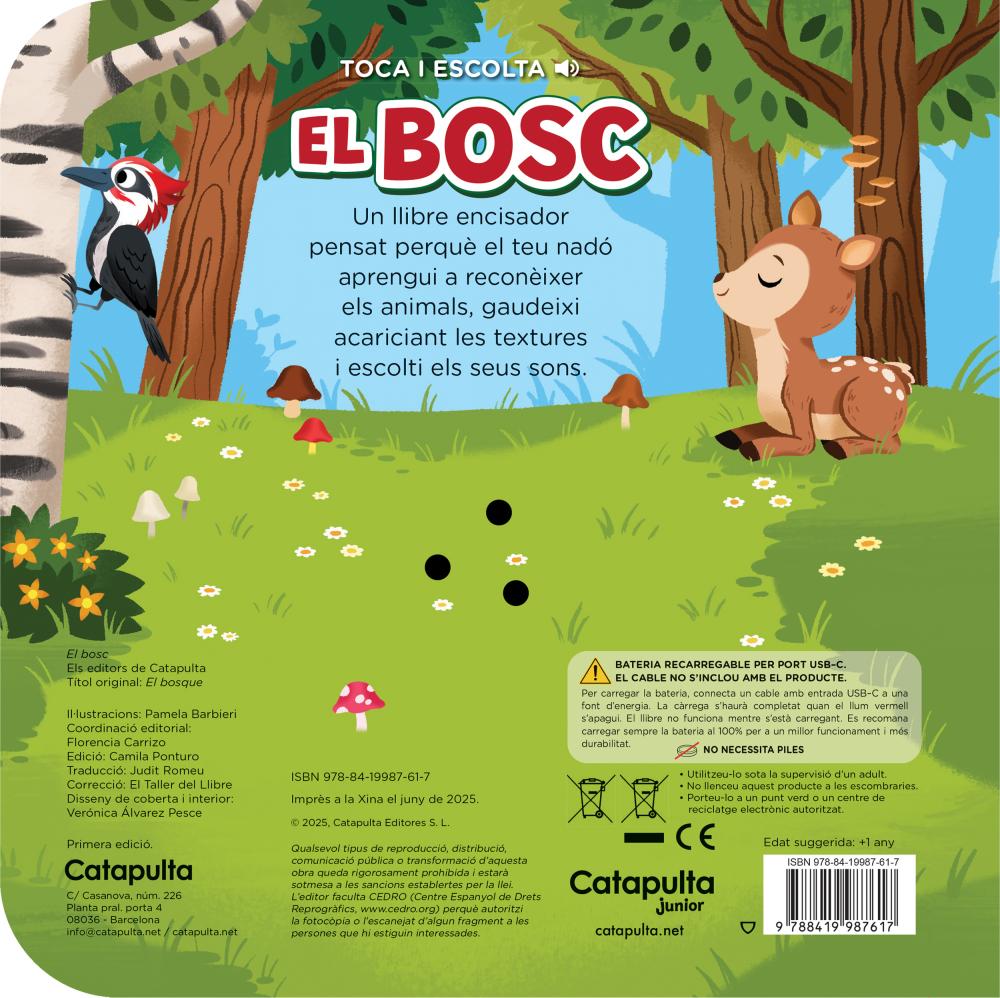 La col·lecció de llibres pensats perquè el bebè aprengui a reconèixer els animals, gaudeixi acariciant-ne les textures i escolti els sons, arriba amb un nou títol: El Bosc. A més, presenta una innovadora tecnologia ecològica i segura: una bateria recarregable per port USB-C, que permet diversió constant sense necessitat de piles. Una excel·lent opció per aprendre i jugar de manera més sostenible!