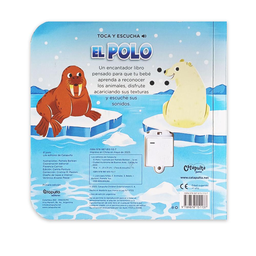 Este nuevo título de la colección Toca y escucha presenta los sonidos del Polo. Las puntas del libro son redondeadas para mayor seguridad, los textos son en letra mayúscula, y cada sonido se escucha al tocar la parte texturada de la página, ¡descubre todos los títulos!
